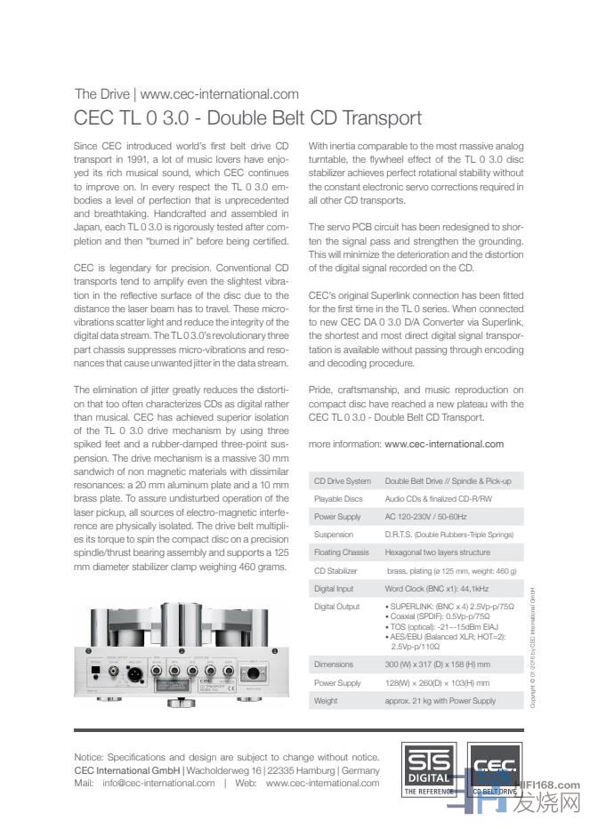 简而言之,CEC转盘看起来很华丽,具有比任何其他数字设备更多的模拟性能。现在谁还听CD呢?CEC TL 0 3.0的表现会让任何问自己这个问题的人哑口无言。”(Fidelity - 2016)
