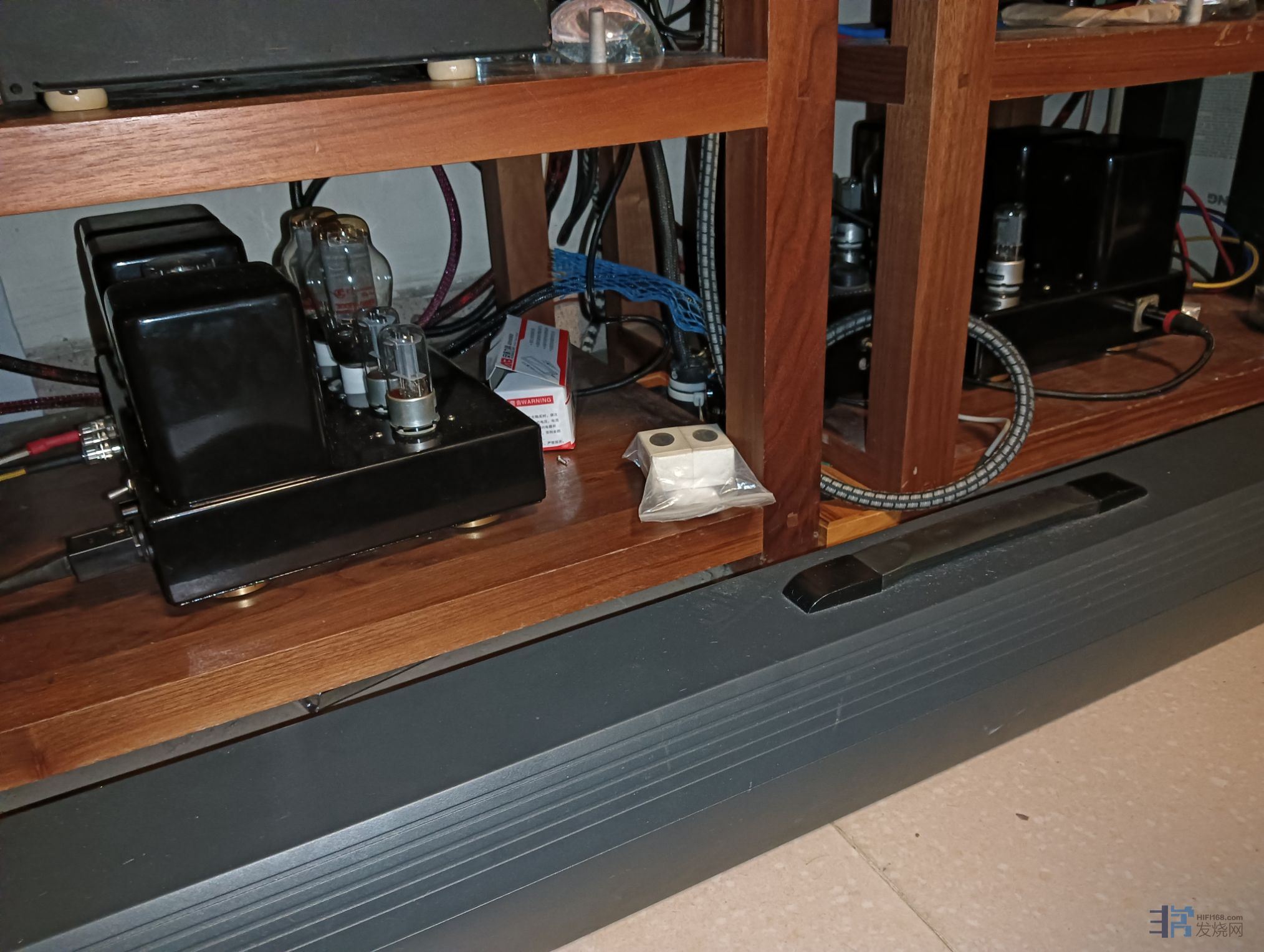 调整了器材摆位和接线,专业功放推杰士低音,传神后级推杰士中高音,以及联盟超高音箱。老曹胆合并机推传神小书架箱